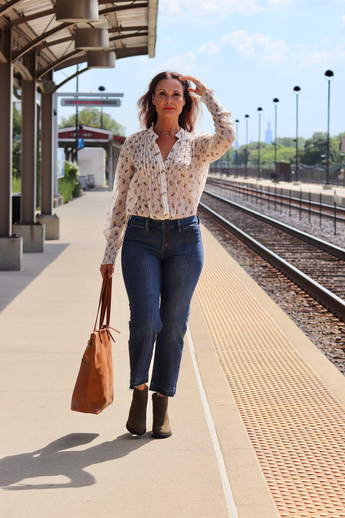 Denise is wearing the Free People Flowers in December blouse and the Eric Michael Quebec Heeled bootie.